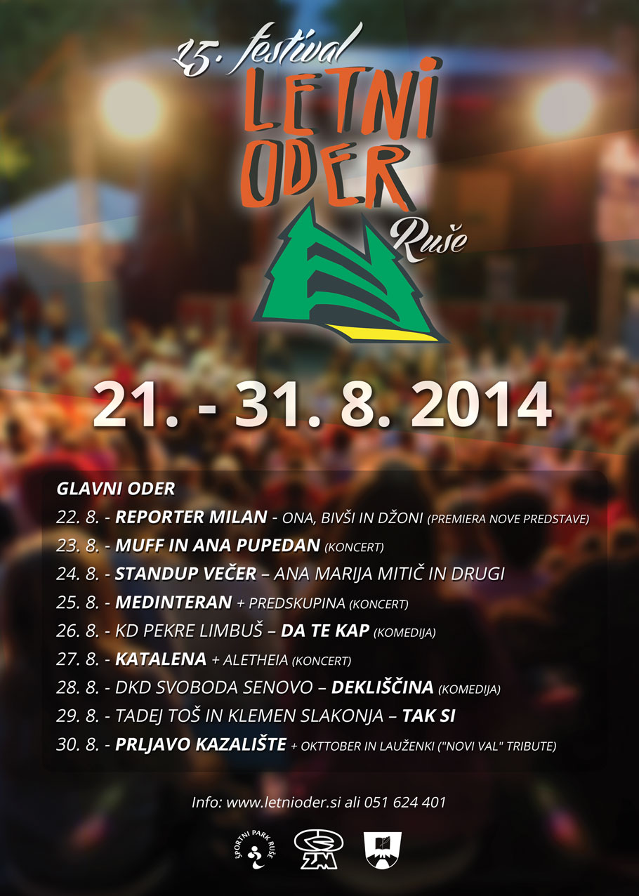 Mesec avgust bo tudi letos v znamenju festivala Letni oder Ruše 2014, že petnajsto leto zapovrstjo. Festival bo med 21. in 31. avgustom v Ruše prinesel svež ustvarjalni vrtinec.