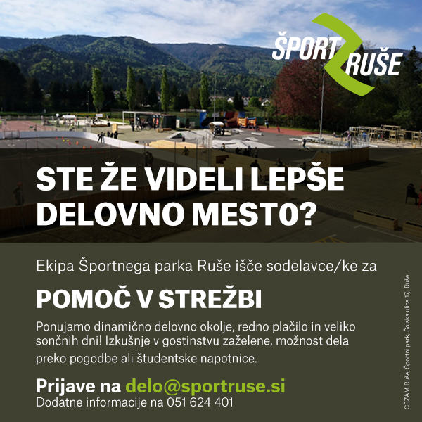 Ekipa Športnega parka Ruše išče sodelavce/ke za NATAKARJE in POMOČ V STREŽBI Ponujamo dinamično delovno okolje, redno plačilo in veliko sončnih dni! Izkušnje v gostinstvu zaželene, možnost dela študentske napotnice ali pogodbe. Prijave na delo@sportruse.si Dodatne informacije na 051 624 401
