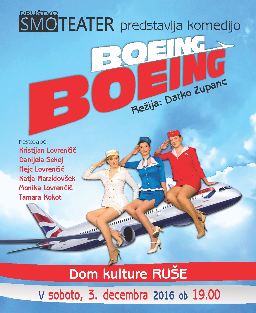 Se želite nasmejati? Želite preživeti prosti čas v družbi stevardes? Potem nikakor ne smete zamuditi komedije BOEING-BOEING. Vstopnice si lahko zagotovite po predprodajni ceni na recepciji Športnega parka Ruše.