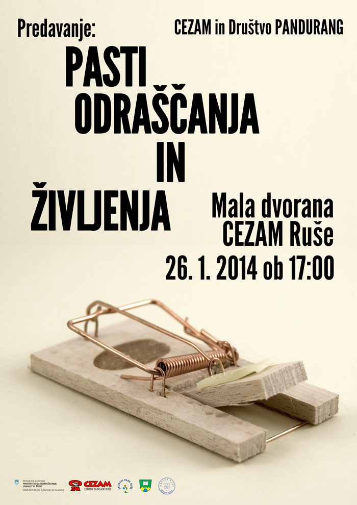 pasti-odraščanjeCEZAM in Društvo PANDURANG vas vabita na predavanje o pasteh sodobnega življenja, ki prežijo na nas v sodobni družbi. S tovrstnimi predavanji ozaveščamo o pomembnosti in nujnosti mirnega in zdravega dozorevanja ter življenja brez grdih razvad in odvisnosti, ki jih svet, družba in korporacije stimulirajo ter oglašujejo; namesto osveščanja mladih o nevarnosti hazarda, alkohola, drog in promiskuitete moderna družba prek vsebin svojih medijev in korporacij ljudi zavaja in izkorišča njihovo vodljivost ter dosežke na področjih psihologije, sociologije in ostalih znanosti.