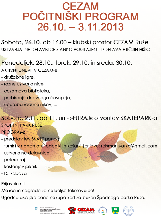 Cezam v času počitnic (26.10. – 3.11. 2013) organizira aktivne dneve za mlade. Zaključili se bodo v soboto 2.11. z veliko otvoritvijo SKATEPARK-a Ruše.