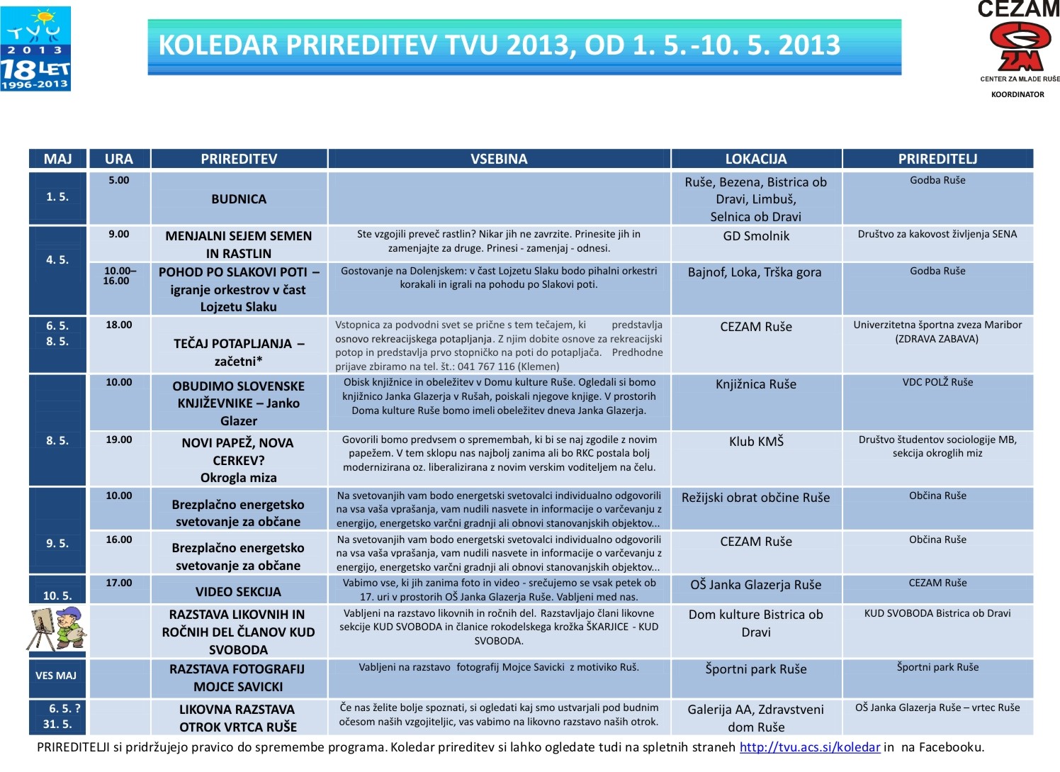 KOLEDAR PRIREDITEV TVU 2013, od 1. 5.-10. 5. 2013